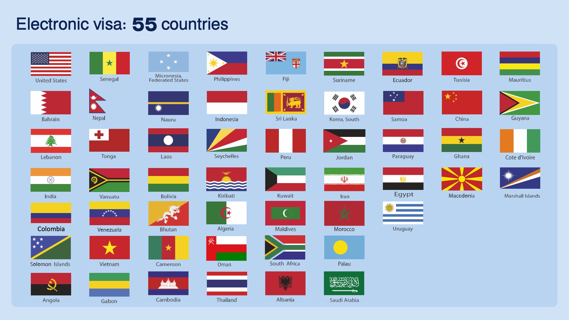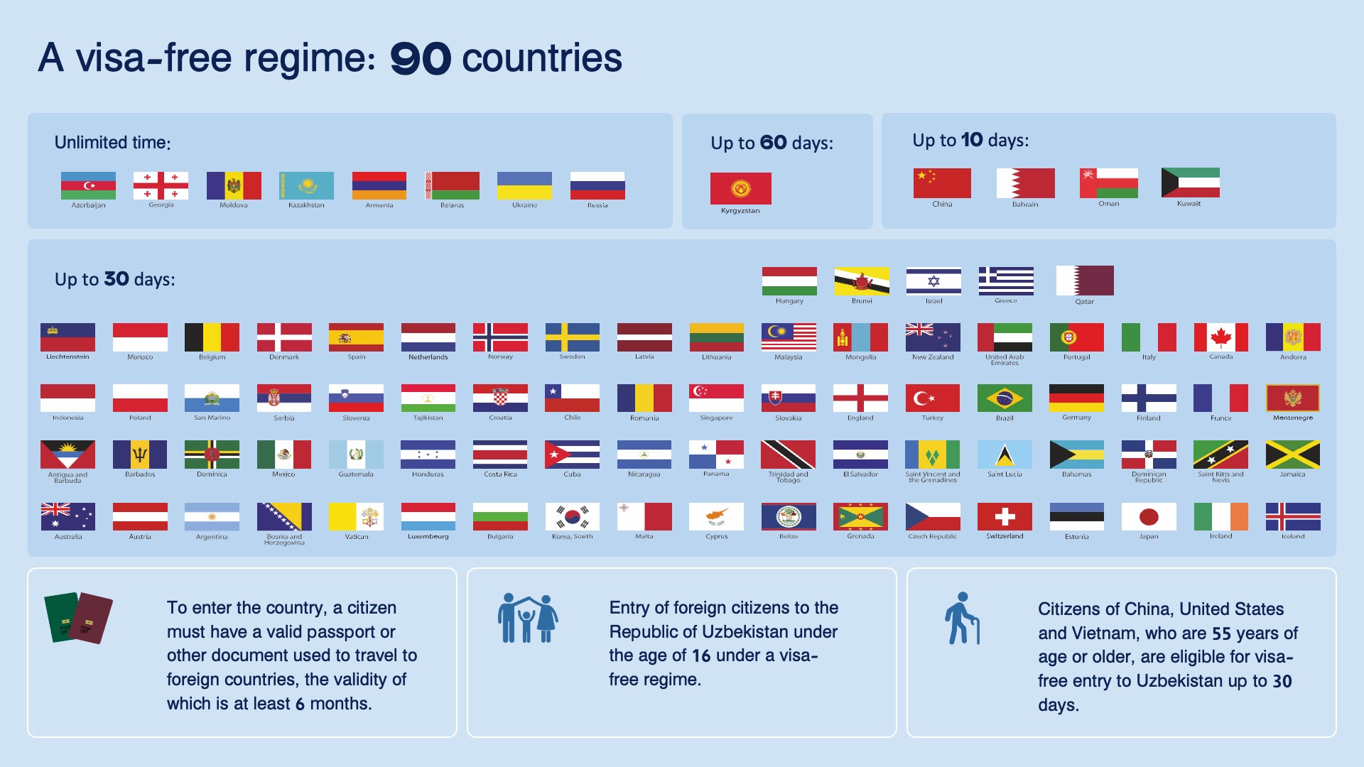 Foreign citizens may enter Uzbekistan and transit through its territory only if they have entry visas in accordance with the legislation of the Republic of Uzbekistan. With the exception of citizens of countries for which a visa-free entry regime (to 91 countries), a visa free-transit (to 47 countries) and an electronic entry visa (to 54 countries) are established by bilateral international treaties of the Republic of Uzbekistan and Decrees of the President of the Republic of Uzbekistan (the list of such countries and information is provided on link).