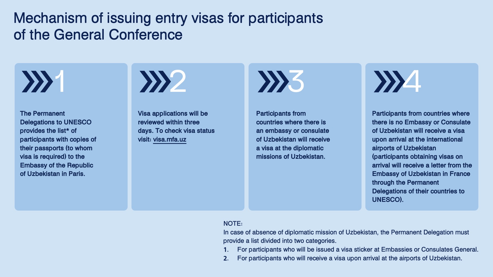 Participants from countries where there is no Embassy or Consulate of Uzbekistan will receive a visa upon arrival at the international airports of Uzbekistan (participants obtaining visas on arrival will receive a letter from the Embassy of Uzbekistan in France through the Permanent Delegations of their countries to UNESCO).