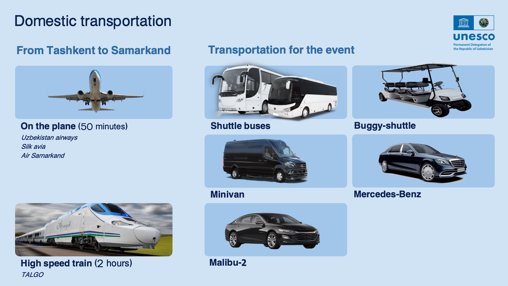 Permanent Delegates of Member States to UNESCO who have applied to the Permanent Delegate of Uzbekistan to UNESCO until 1 July 2025, will be provided with seats (economy class) in the 1+2 format on a charter flight on the Paris-Samarkand (28 October, 2025) and Samarkand-Paris (14 November, 2025) route, which is covered by Uzbekistan. Transportation of the UNESCO Secretariat will be organized on dates agreed upon with UNESCO.